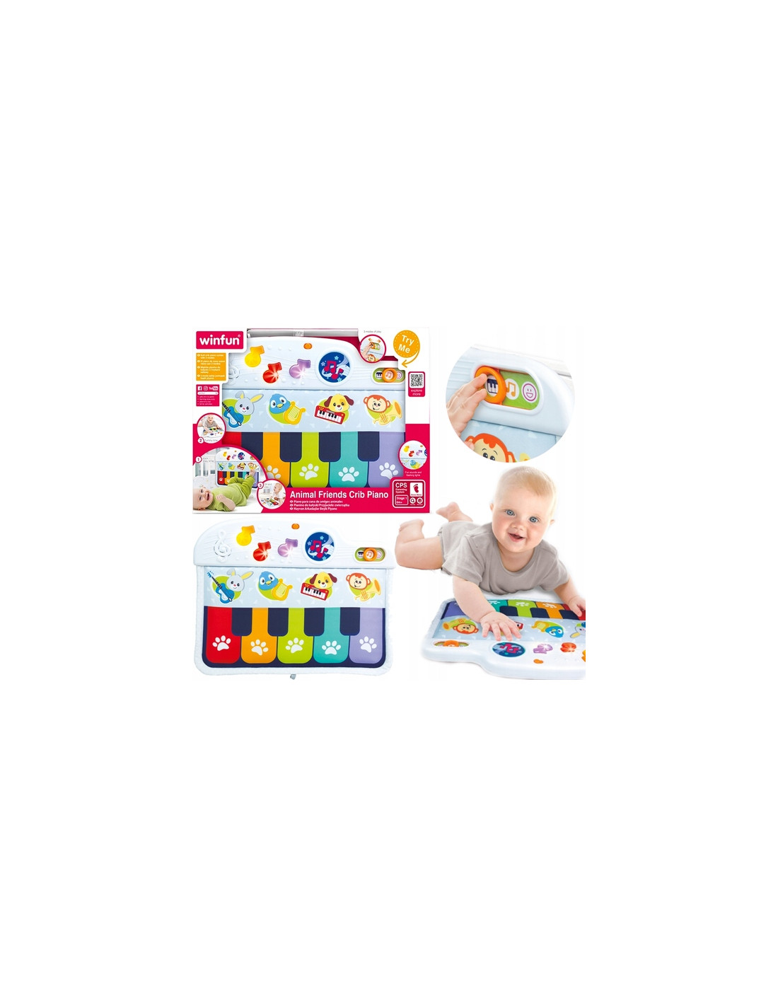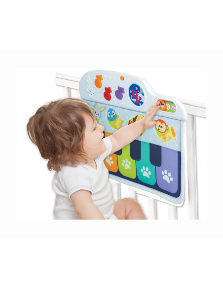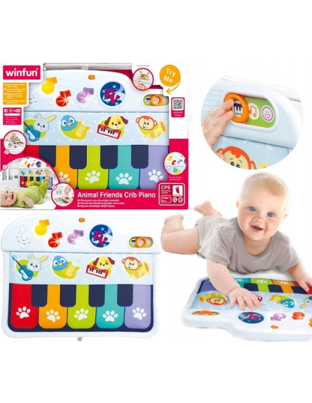 Miękkie pianinko do łóżeczka, dziecko zajmuje się pianinkiem poprzez kopanie lub naciskanie w klawisze.