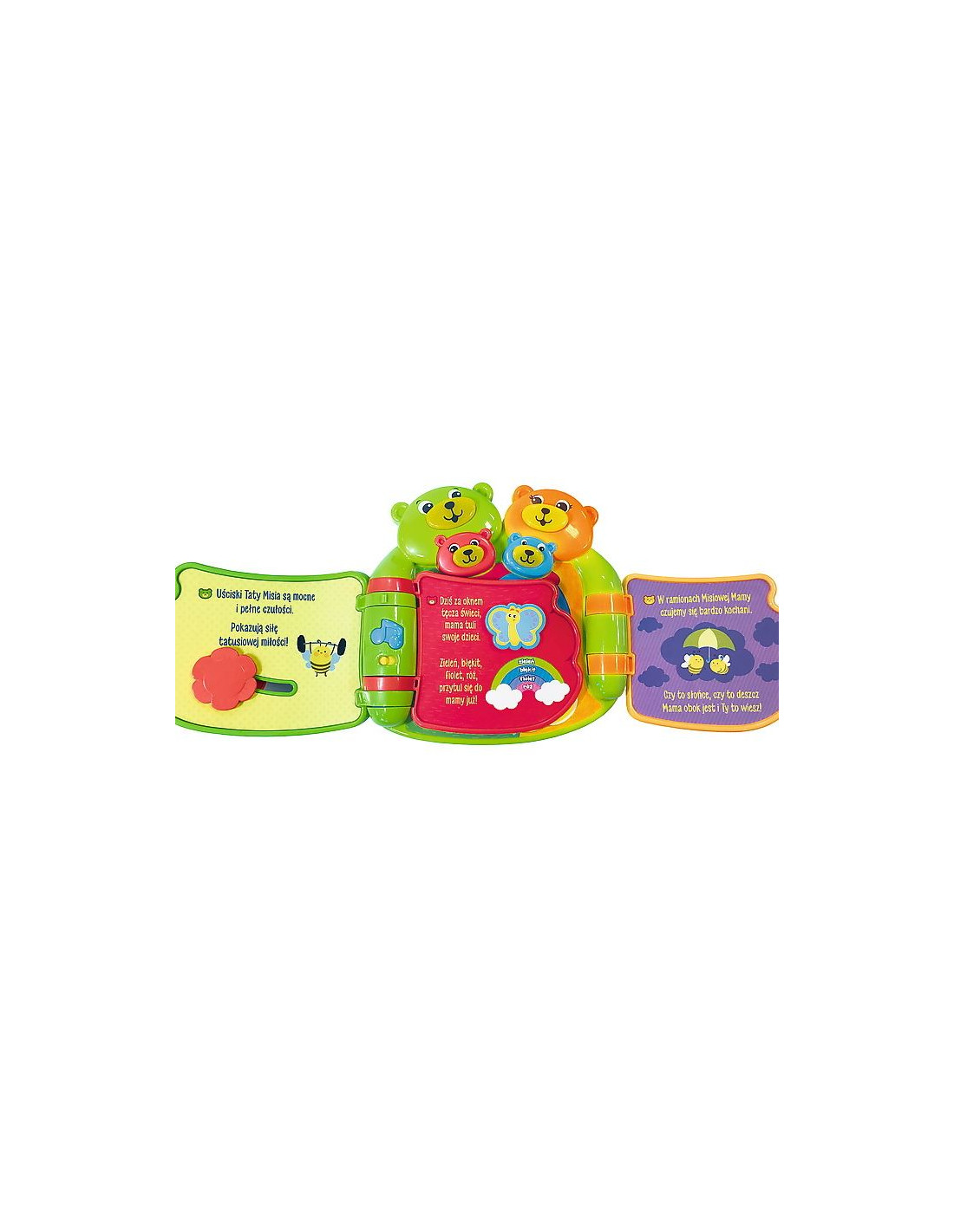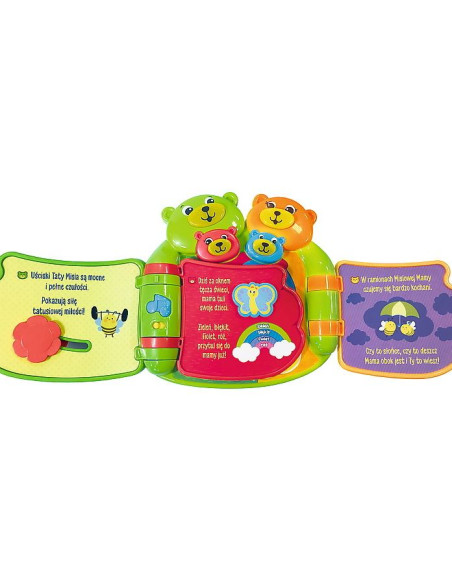 Urocza książeczka opowiadająca o relacjach Misiowej Rodziny. W książeczce znajdziemy 6 starannie zaprojektowanych, interaktywnych, kolorowych stron opowiadających historię Misiowej Rodziny. Na każdej ze stron znajduje się ciekawa historia o każdym członku rodziny. 6 kolorowych przycisków uruchamia urocze zwroty i piosenki. Przycisk Melodii uczy kształtów, liczenia oraz kolorów. Na brzuszku Misiowego Brata znajduje się przycisk chichotania, wystarczy przesunąć przycisk w górę i w dół, aby posłuchać wesołego chichotu. 4 urocze przyciski w postaci buziek Misiów - każda buźka Misiowej Rodziny jest podświetlana oraz wygrywa słodkie rymowanki. Zabawka uczy: realcji rodzinnych, kolorów, kształtów, cyfr oraz rozwija motorykę. Wymiary opakowania: 250 x 78 x 279 mm Baterie: 2 x AA Dla dzieci w wieku: 6m+
