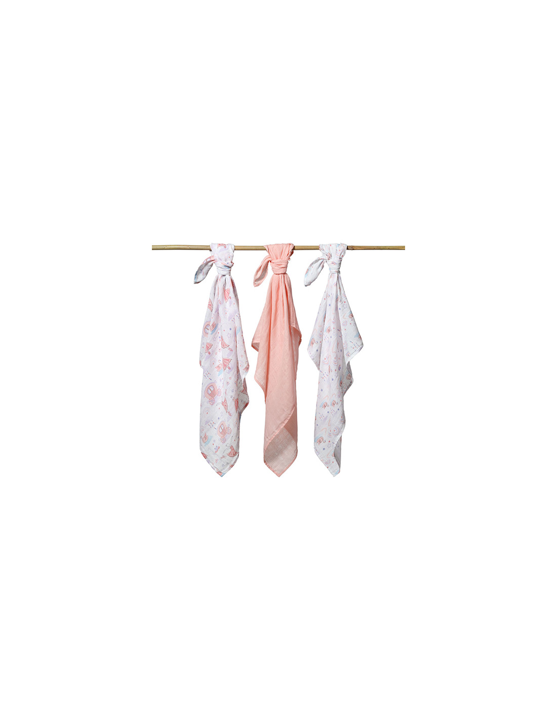 Muślin to tkanina oddychająca. Lekki splot włókien sprawia, że pieluszki przepuszczają powietrze. Także w czasie spaceru, kiedy użyjesz ich na przykład jako przewiewnego otulacza albo kocyka.