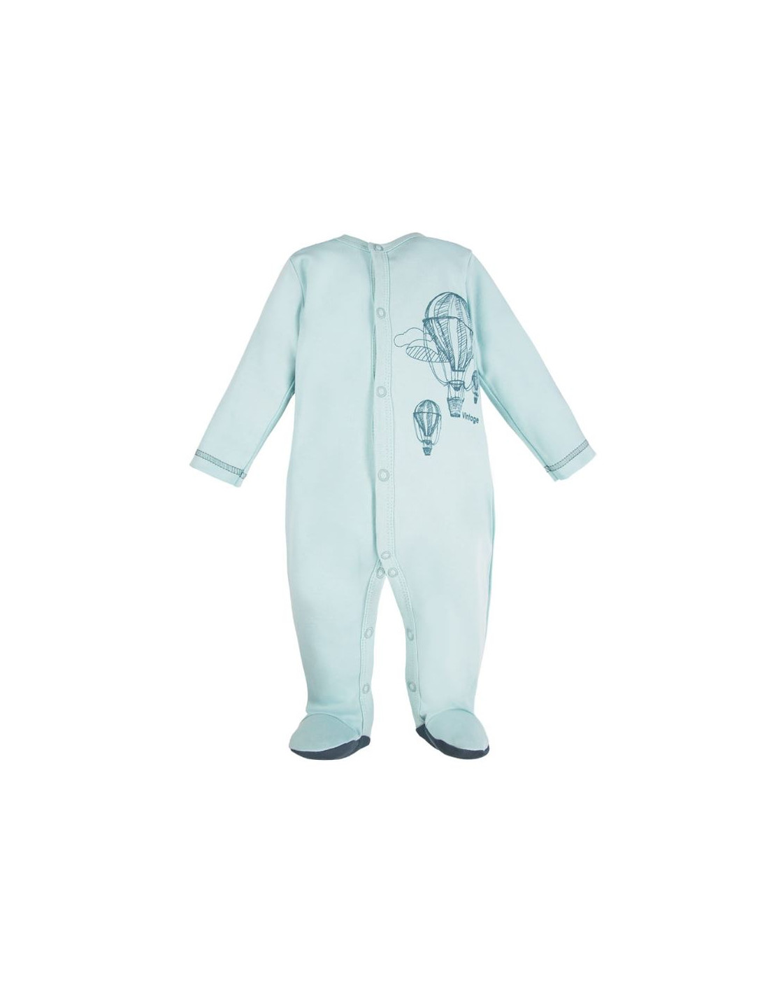 Turkusowy pajac dziecięcy ze stopkami z kolekcji "Balloons" uszyty z miękkiej i przyjemnej w dotyku dzianiny bawełnianej. Elementem odzobnym jest rysunek balonika na przodzie. Krój umożliwia całkowite rozpięcie, przez co ubranko jest funkcjonalne i wygodne. Pajac wykończony jest lamówką. Pajace niemowlęce idealnie sprawdzają się w pierwszych miesiącach życia dziecka. Wykorzystywany jako ubranko do spania lub wyjściowe.