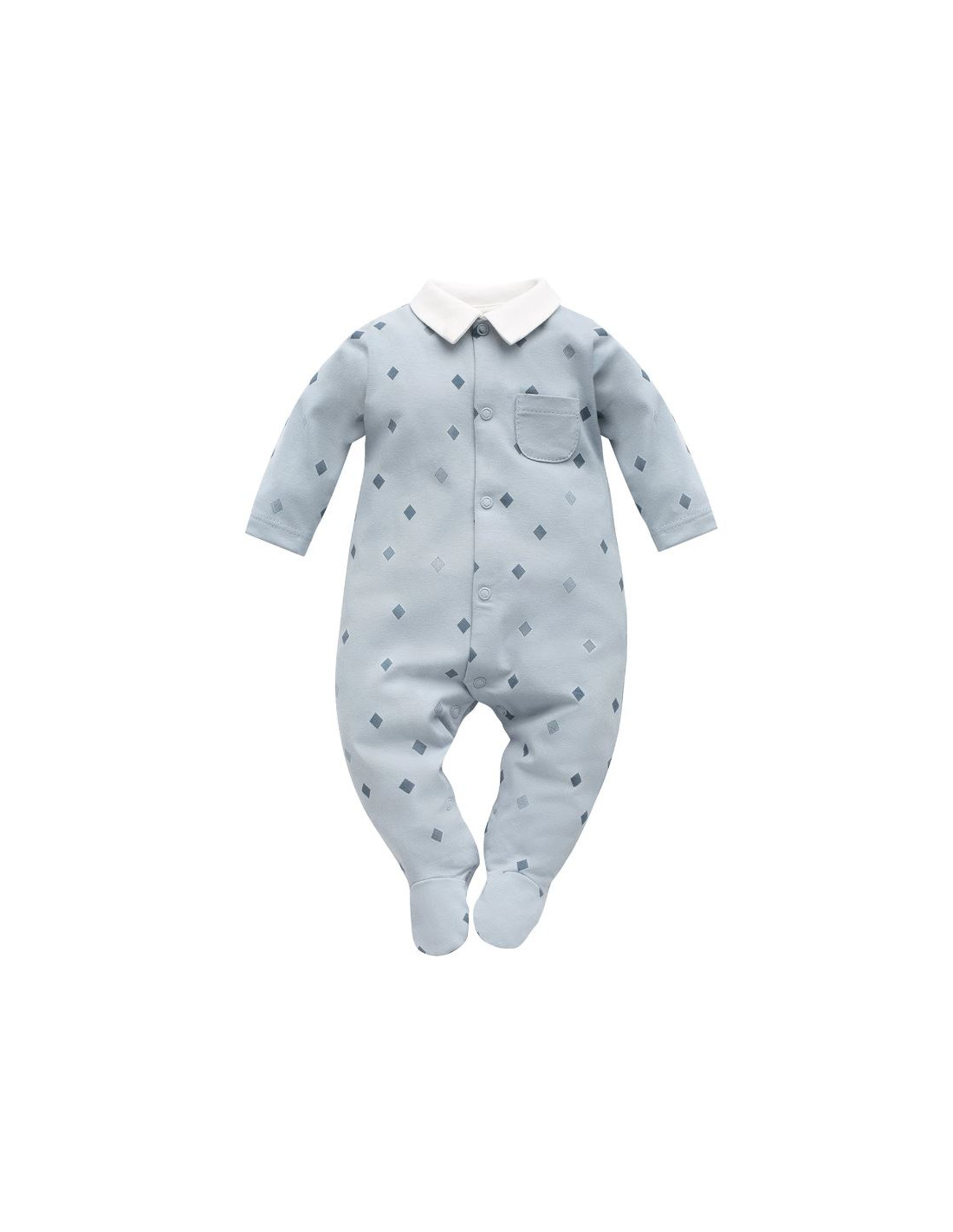 Model w kolorze niebieskim ozdobiony jest stylowym nadrukiem rombów, wykonanym trwałymi i bezpiecznymi farbami wodnymi, odpornymi na częste pranie i codzienne użytkowanie. Uwagę przyciąga elegancki kołnierzyk w kolorze écru oraz praktyczna kieszonka po lewej stronie, które nadają ubranku wyjątkowego charakteru.