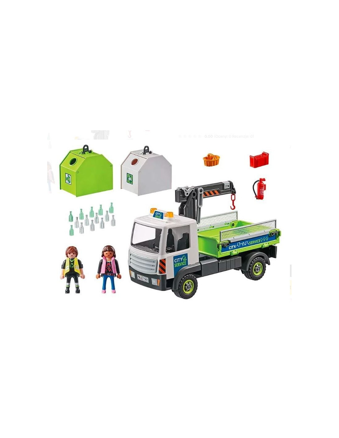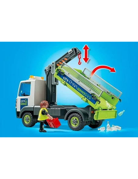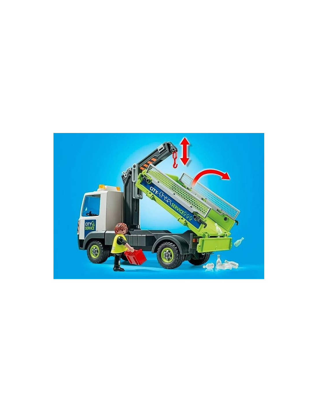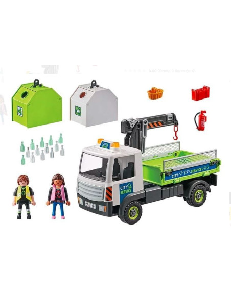 Zestaw zawiera dwie figurki PLAYMOBIL, samochód ciężarowy z obrotowym dźwigiem, dwa kontenery, butelki i inne dodatki do urozmaiconej zabawy w pokoju dziecięcym. Dach ciężarówki można zdjąć, aby umieścić w niej figurki.