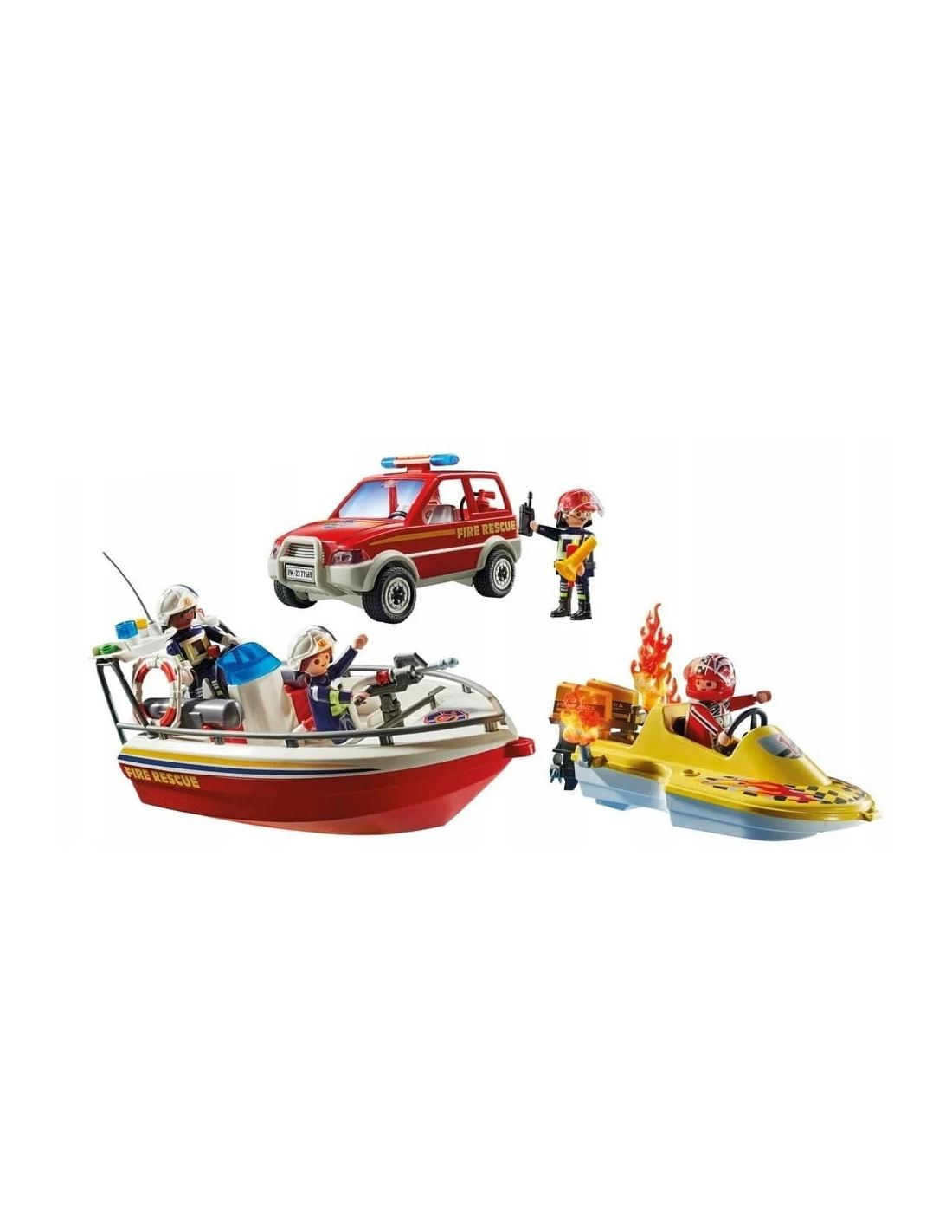Zawartość: 1x wóz strażacki, 1x łódź motorowa, 1x łódź strażacka i 3x figurki
