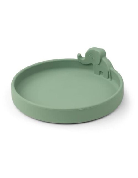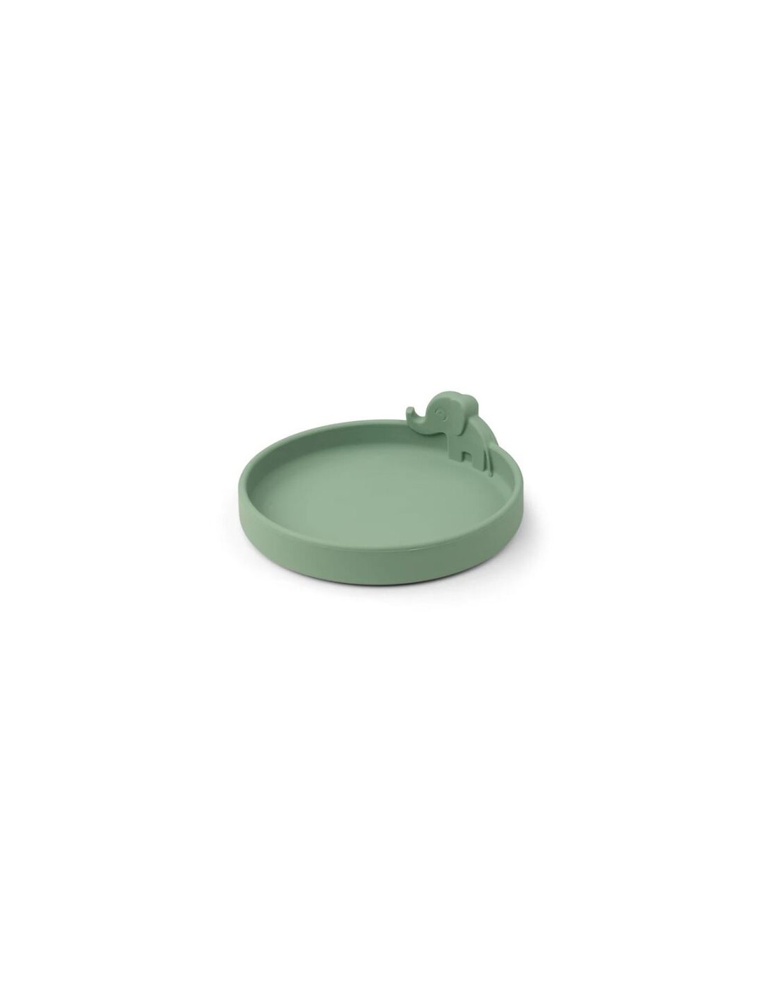 Peekaboo, czas na jedzenie! Elphee wychyla się z boku praktycznego silikonowego talerza, gotowa, by uczynić posiłek jeszcze przyjemniejszą chwilą dnia. Dzięki zaokrąglonym wewnętrznym krawędziom talerz idealnie nadaje się do łatwego nabierania, gdy maluchy uczą się samodzielnego jedzenia.