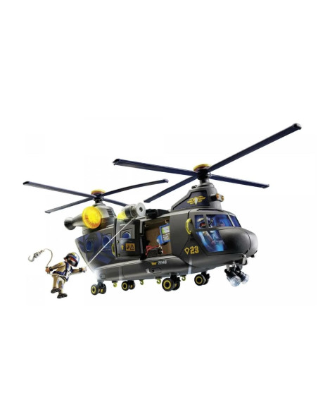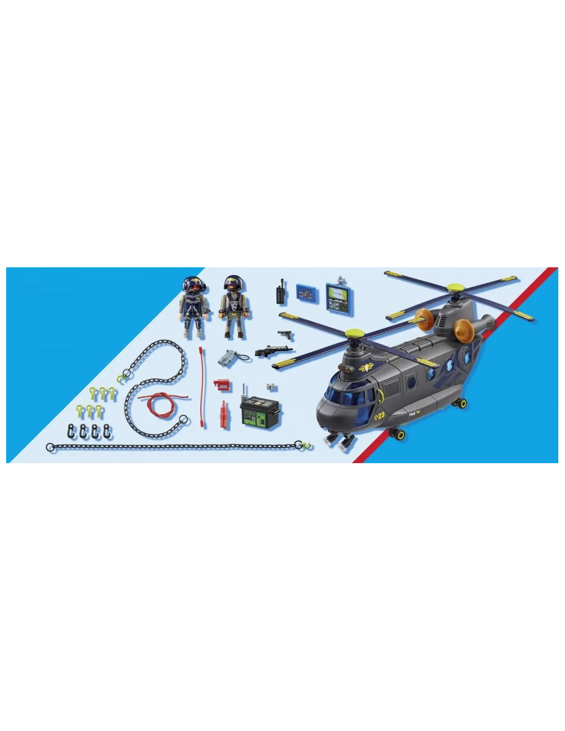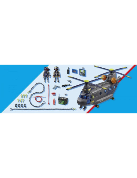 Dzięki helikopterowi ratunkowemu PLAYMOBIL z wyciągarką nawet misje w powietrzu nie stanowią wyzwania dla jednostki taktycznej. W kokpicie mogą siedzieć dwie figurki, a w przestrzeni ładunkowej znajdują się jeszcze dwa składane siedzenia dla dodatkowych figurek.