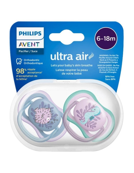 Smoczek ultra air został zaprojektowany z myślą o swobodnym przepływie powietrza, dzięki czemu wrażliwa skóra dziecka oddycha.